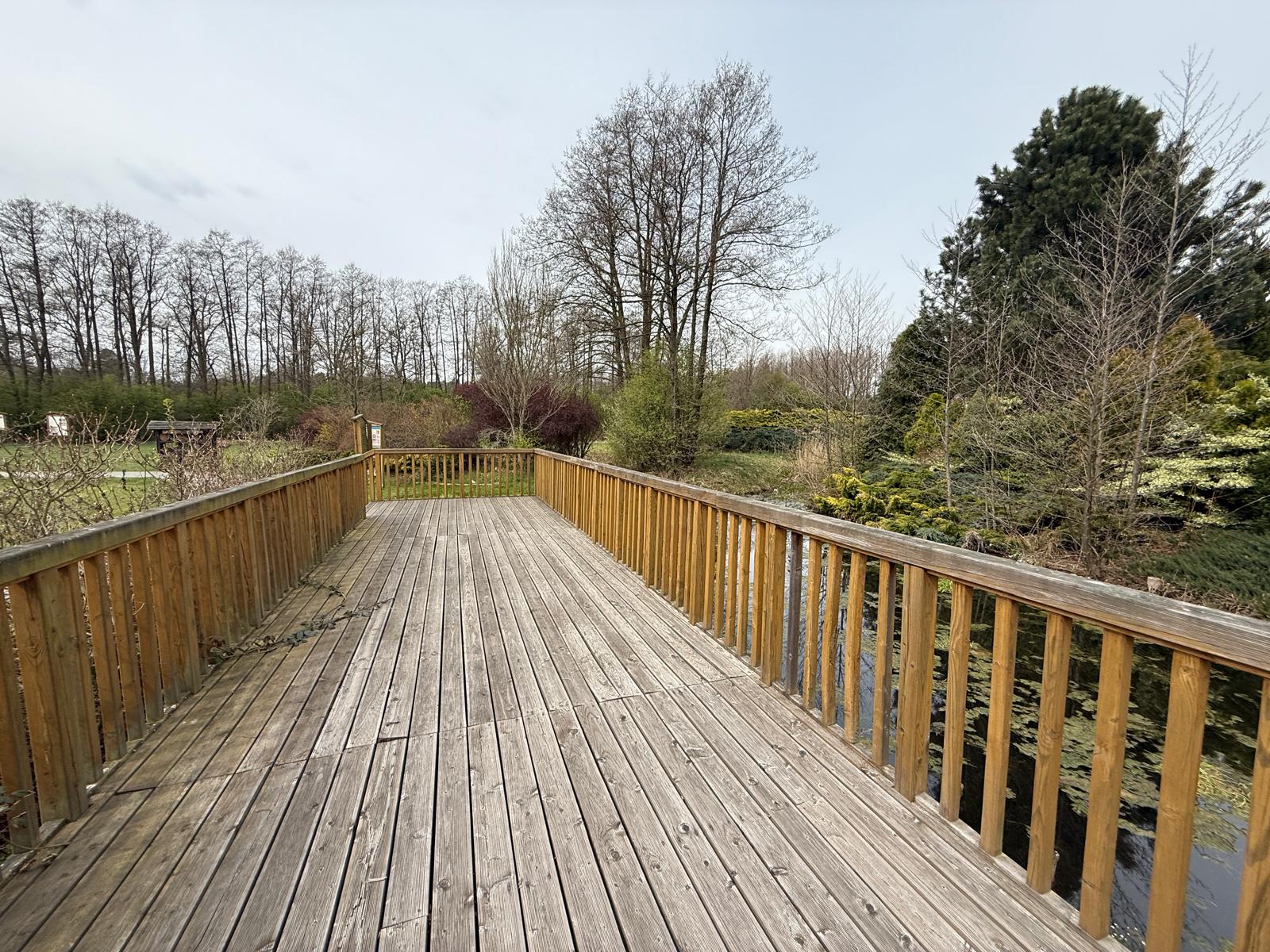 Idąc dalej drewnianą kładką, po prawej stronie widzimy tablicę zawierającą zagadnienia dotyczące małej retencji oraz pomost, z którego roztacza się piękny widok na oczko wodne oraz skalniak z kaskadą wodną.
